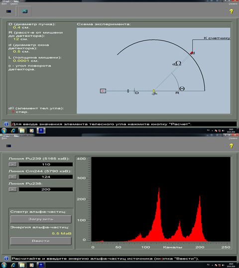 Лабораторная установка формирует одно рабочее место и обеспечивает проведение эксперимента по теме «Взаимодействие альфа-излучения с веществом» учебного лабораторного практикума. Лабораторный комплекс используется для постановки лабораторных работ, а также для проведения практических и демонстрационных занятий по курсу «Физика ядра и частиц».