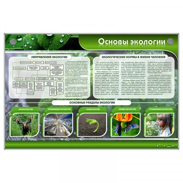 Электрифицированный стенд предназначен для получения учащимися общеобразовательных учреждений знаний об основных направлениях экологии, сферах, которые она изучает, и о важности соблюдения экологических норм на предприятиях и в других сферах промышленности.