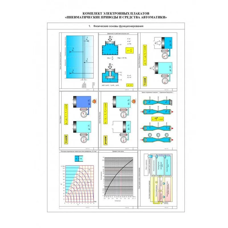 Электронные плакаты предназначены для наглядной демонстрации физических функционирования пневмосистем, конструкций основных элементов пневмоавтоматики, а также релейно-контактных устройств и элементов.