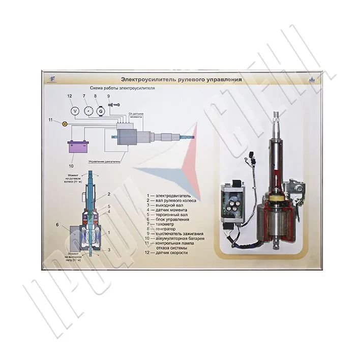 Стенд-планшет предназначен для методического сопровождения учебного процесса по изучению электроусилителя рулевого управления легкового автомобиля, принципов их функционирования и режимов работы, а также формированию первоначальных навыков по техническому обслуживанию и ремонту автомобиля в курсах «Устройство автомобильной техники», «Эксплуатация автомобильной техники», «Конструкция и расчет автомобильной техники».