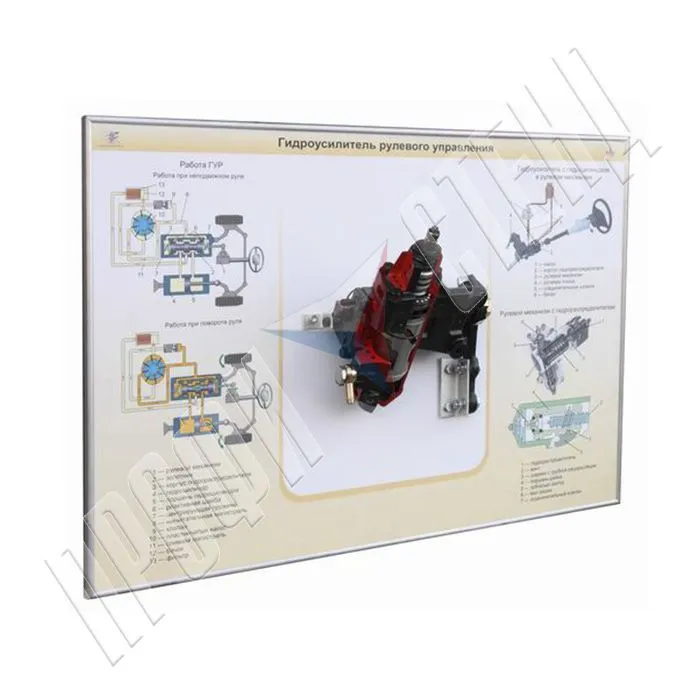 Стенд-планшет предназначен для методического сопровождения учебного процесса по изучению гидроусилителя рулевого управления легкового автомобиля, принципов их функционирования и режимов работы, а также формированию первоначальных навыков по техническому обслуживанию и ремонту автомобиля в курсах «Устройство автомобильной техники», «Эксплуатация автомобильной техники», «Конструкция и расчет автомобильной техники».