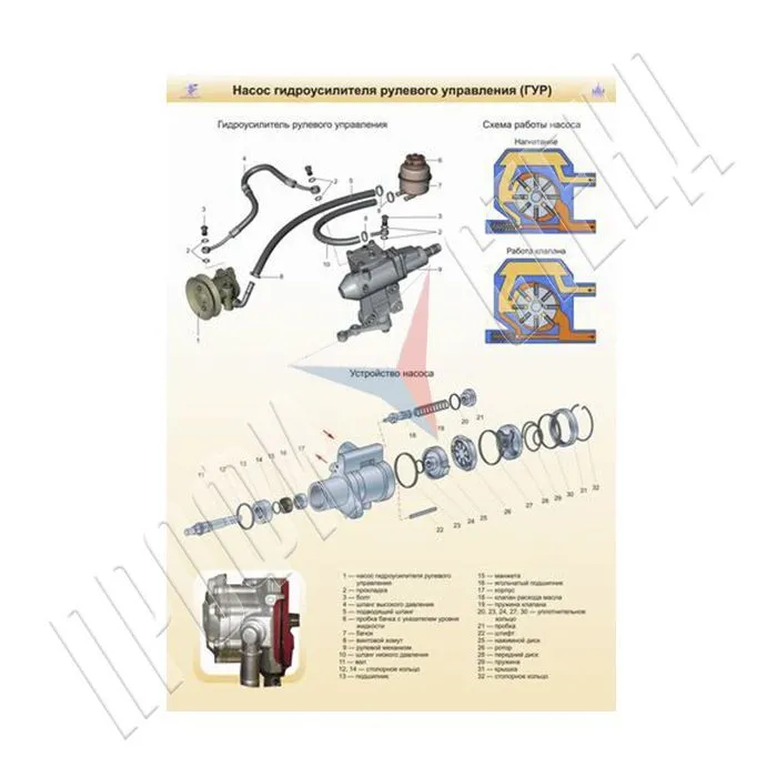 Стенд-планшет представляет собой основание из МДФ толщиной, не менее 8 мм окантованное алюминиевым профилем. На основание наклеена подложка с цветографическим изображением устройства насоса гидроусилителя рулевого управления легкового автомобиля переднеприводного и смонтированы натуральные элементы в разрезе: насос гидроусилителя рулевого управления устанавливаемый на легковые переднеприводные автомобили марки «ВАЗ».