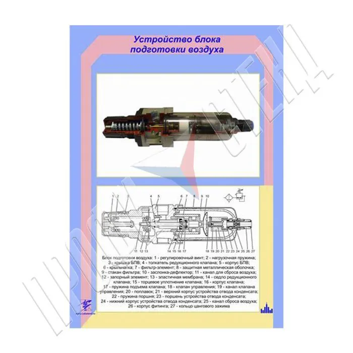 - Планшет с изображением конструкции и схемы работы блока подготовки воздуха, блок подготовки воздуха в разрезе