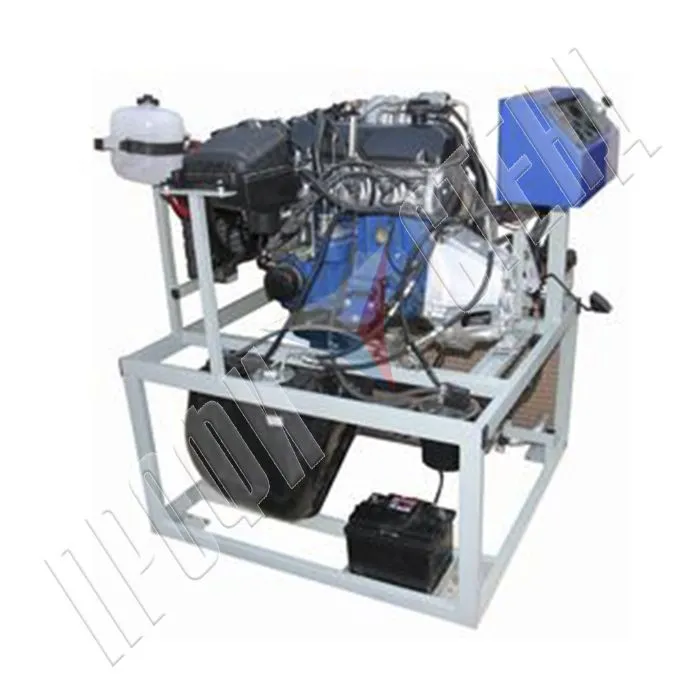 Учебный стенд состоит из: двигателя с навесным оборудованием, блока управления с замком зажигания и электрооборудованием, топливного бака с указателем уровня топлива и топливопроводами, аккумуляторной батареи для пуска двигателя, глушителя шума двигателя с каталитическим нейтрализатором и мобильной рамы с защитными решетками и бортового компьютера с возможностью индикации ошибок контроллера ДВС.