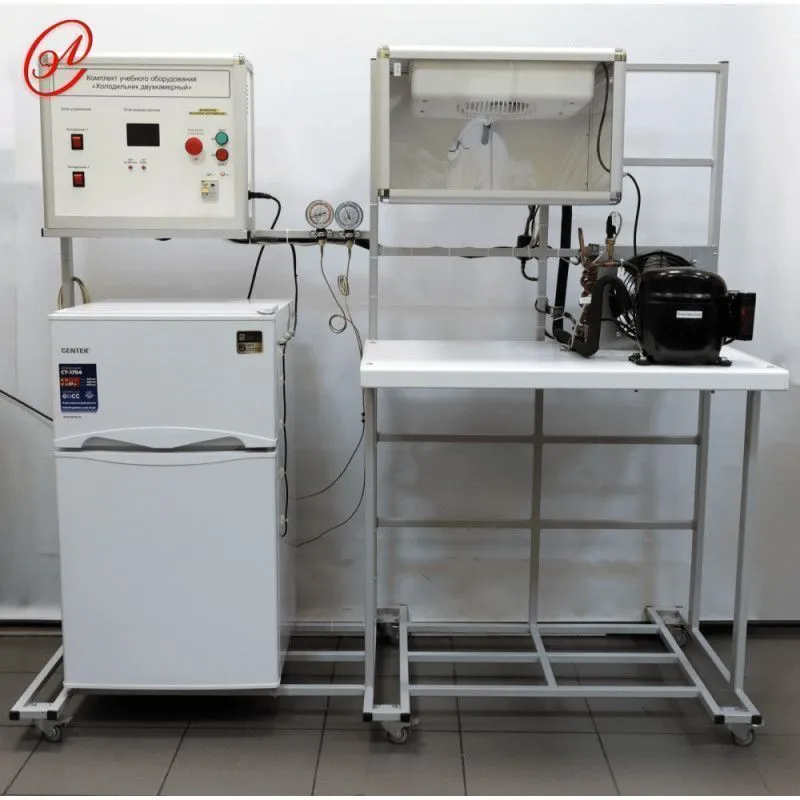 Стенд "Холодильник двухкамерный" ЭЛБ-010.013.01 предназначен для демонстрации работы бытового двухкамерного компрессионного холодильника и изучение технологических операций, используемых при эксплуатации и ремонте холодильников, а также для построения циклов и внешних характеристик, расчета параметров холодильных машин, динамических характеристик теплообменных аппаратов. Комплект выполнен согласно ТУ 32.99.53–001–09519063– 2019 и имеет соответствующий сертификат производителя ГОСТ Р на данный вид продукции и сертификат качества ИСО 9001-2015.