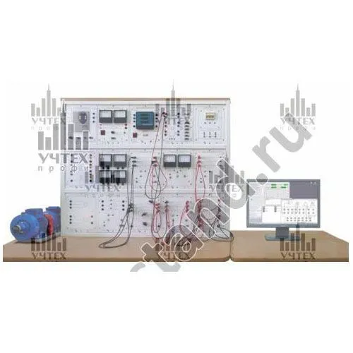 1. Модули: питания стенда; ввода-вывода с платой ввода-вывода; измерителя мощности; возбуждения; преобразователь частоты; трехфазной сети; измеритель скорости; выключателя; измерительный (2 шт); однофазных трансформаторов (2 шт); линии электропередач; синхронизации; агрегата.2. Электромашинный агрегат (асинхронный двигатель с короткозамкнутым ротором, универсальная машина переменного тока, энкодер).