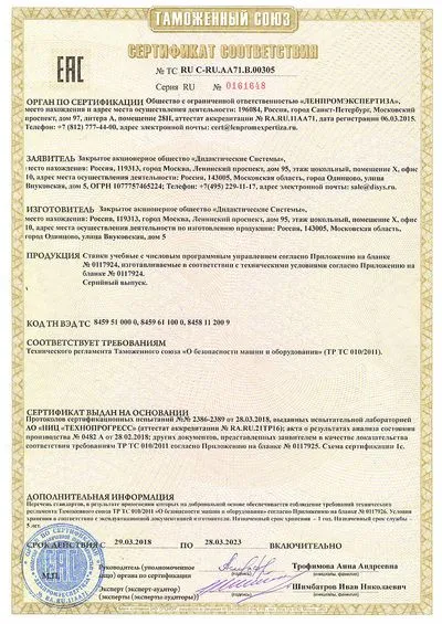 - Станок безопасен для использования в учебных заведения любого уровня и имеет Сертификат Соответствия требованиям технического регламента Таможенного союза «О безопасности машин и оборудования».