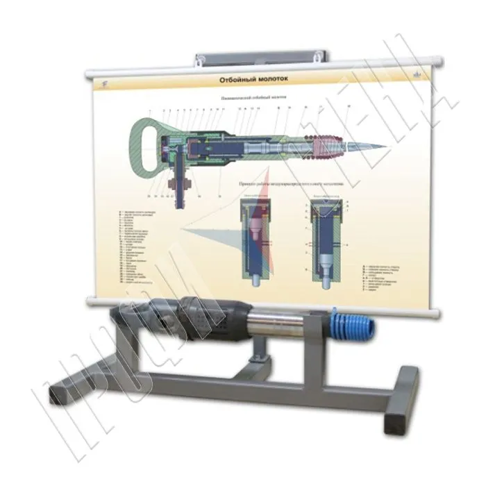 Стенд-тренажер представляет собой отбойный молоток, подготовленный для разборки/сборки, на металлическом основании с цветным плакатом иллюстрирующем устройство и принцип действия