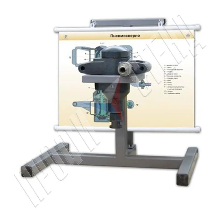 Стенд-тренажер представляет собой пневмосверло, подготовленное для разборки/сборки, на металлическом основании с цветным плакатом иллюстрирующем устройство и принцип действия