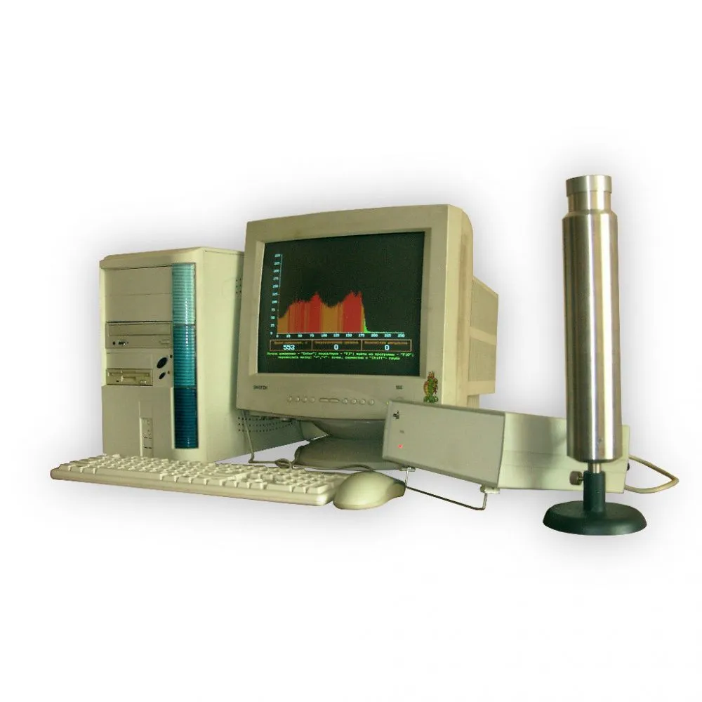 Установка состоит из сцинтиллятора который преобразует гамма-излучение в световые импульсы, которые усиливаются в фотоэлектронном умножителе. Полученные электрические импульсы измеряются и передаются на ПК с помощью устройства измерительного. Устройство измерительное также имеет преобразователь напряжения для питания фотоэлектронного умножителя. Подключение к ПК осуществляется через RS232 или USB.