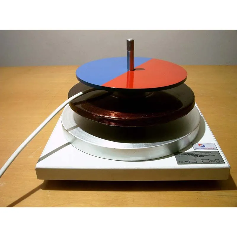 Установка состоит из деревянного основания со стержнем в центре, на который одеваются массивный алюминиевый диск, катушка и легкий алюминиевый диск.