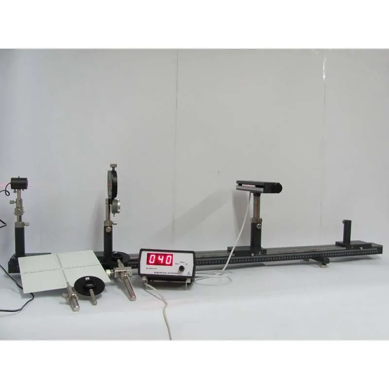 Установка состоит из лазера с источником питания, двойных щелей, щели с изменяемой шириной, фоторезистора, который может перемещаться вдоль дифракционной картины с возможностью измерения интенсивности максимумов, измерителя фототока и экрана с миллиметровой шкалой в виде креста, устанавливаемых в рейтерах на оптической скамье. На боковой поверхности скамьи нанесена миллиметровая шкала.