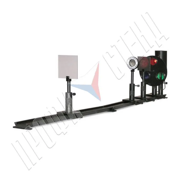 Состав: оптическая скамья, галогеновая лампа в корпусе, блок питания, собирающая линза, контейнер со светофильтрами, мишень, экран, набор стационарных и подвижных рейтеров.