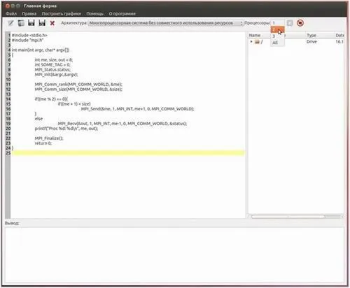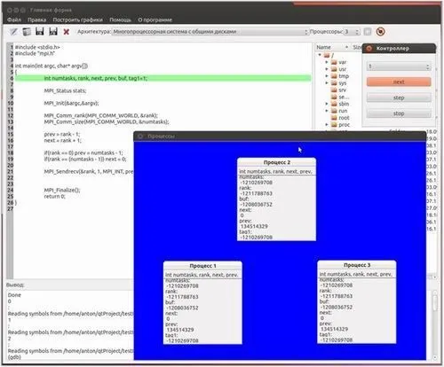 - отображения анимации исполнения алгоритма с возможностью визуализации выбранной многопроцессорной системы, процесса обмена сообщениями между процессами исполняемого алгоритма и ситуации коллизии при работе параллельного алгоритма;